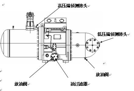 2.壓縮機的潤滑油,從油過濾器上的放油閥處放出,潤滑油接近放完時,從壓縮機的高壓端偵測接頭處,注入一定壓力的氮氣(1.0MPa左右),用壓力加快潤滑油排出,停止注入氮氣,關閉放油閥。然后將壓縮機的油過濾器拆卸下來,將油槽里的潤滑油全部放出來,再將油過濾器清洗后裝上緊固。如圖所示: